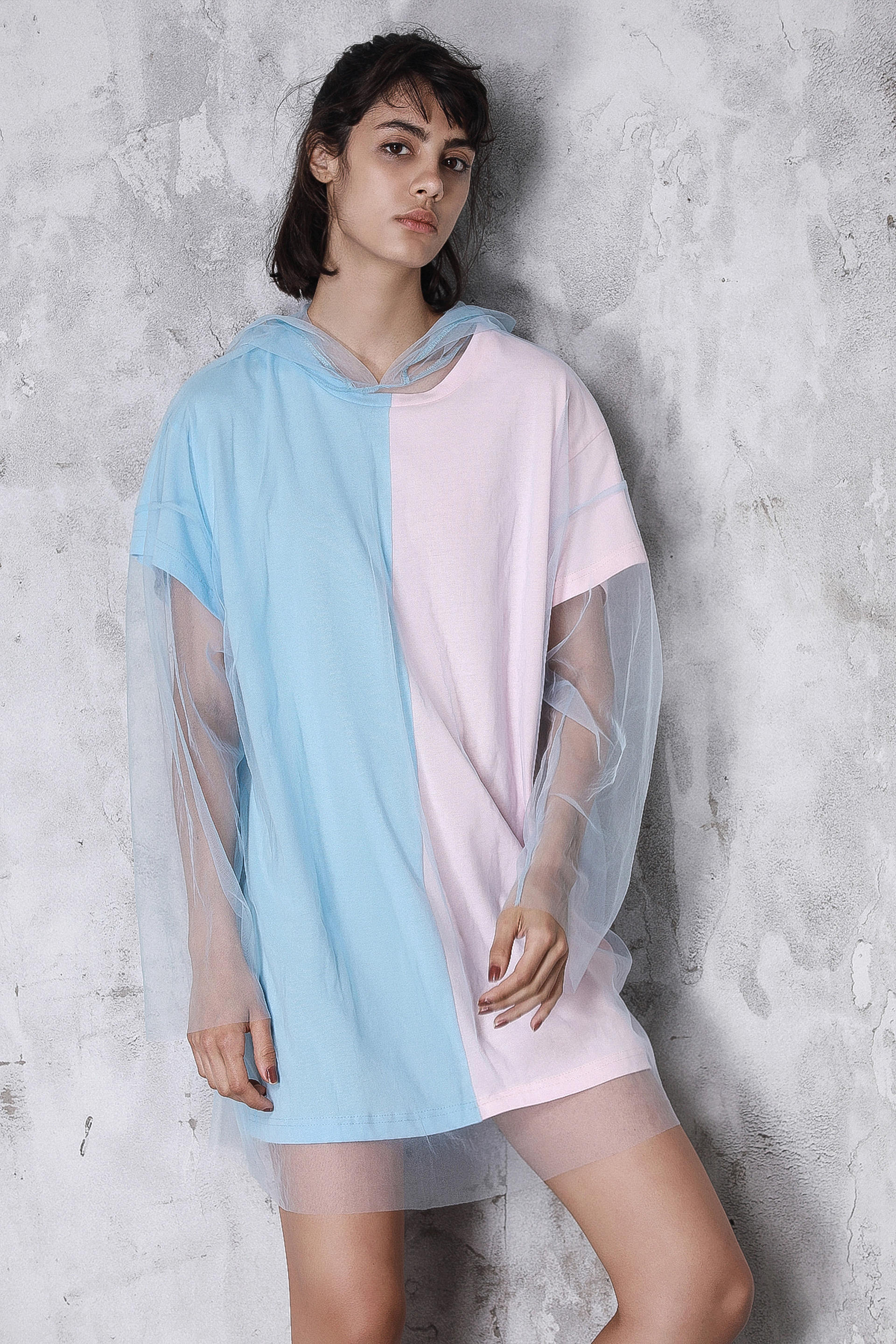粉蓝撞色网纱两件套
