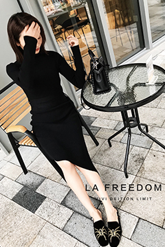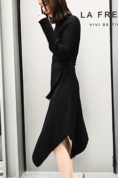 高领针织斜摆长裙