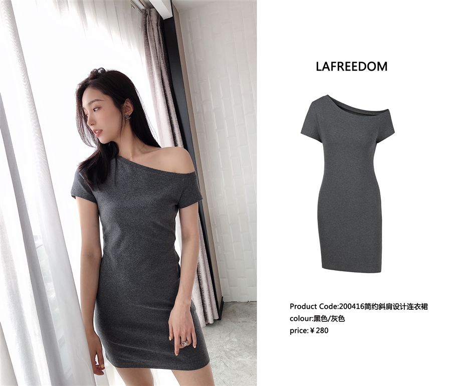 200416简约斜肩设计连衣裙
