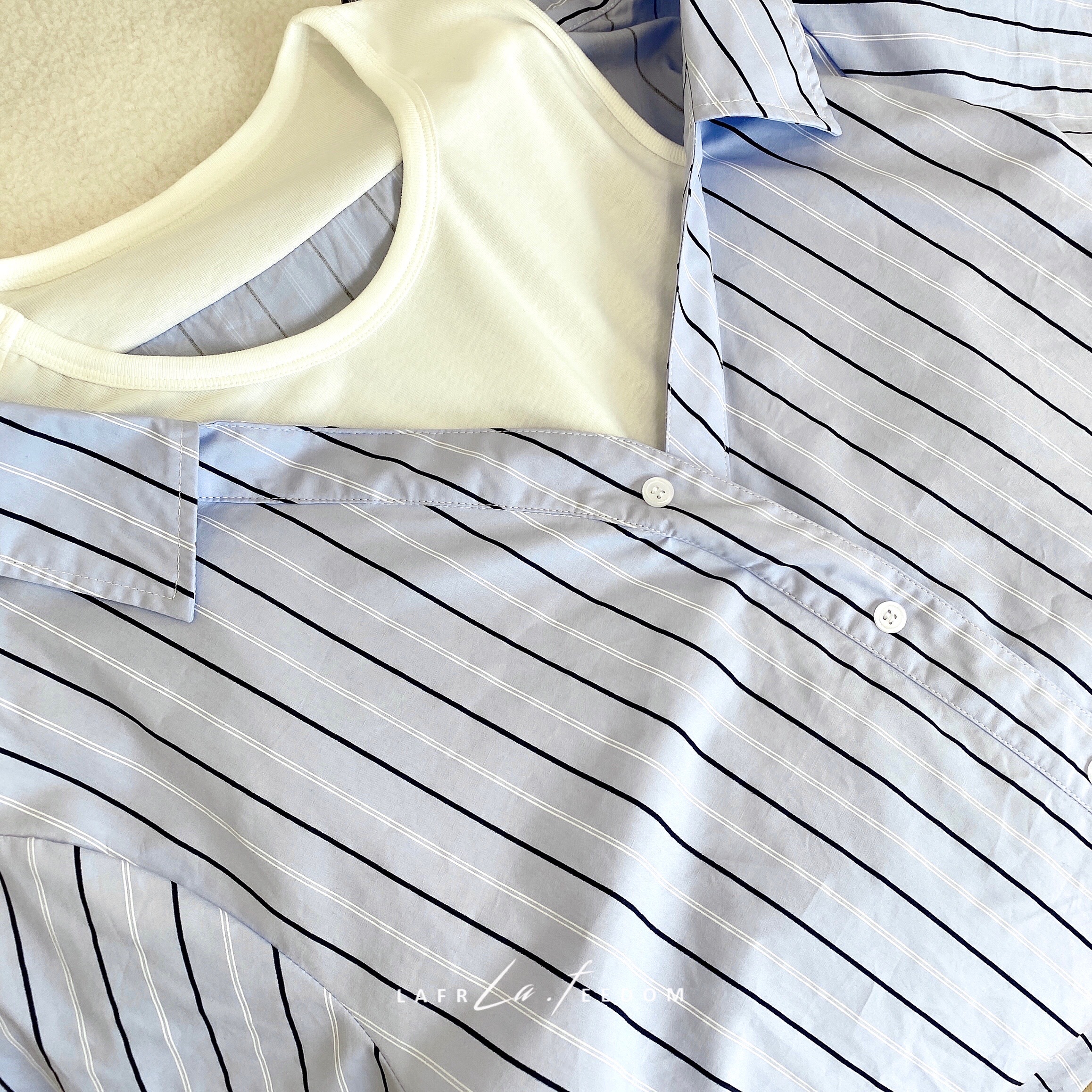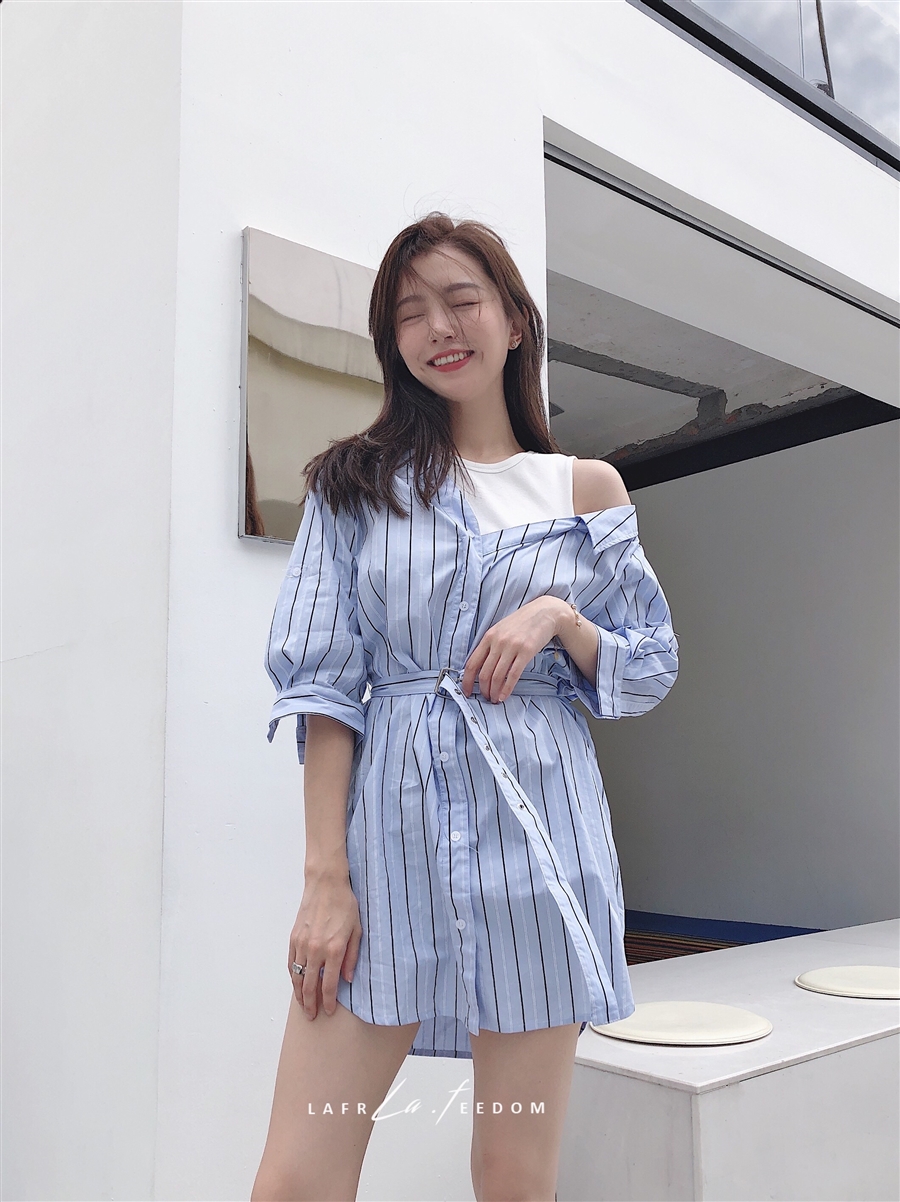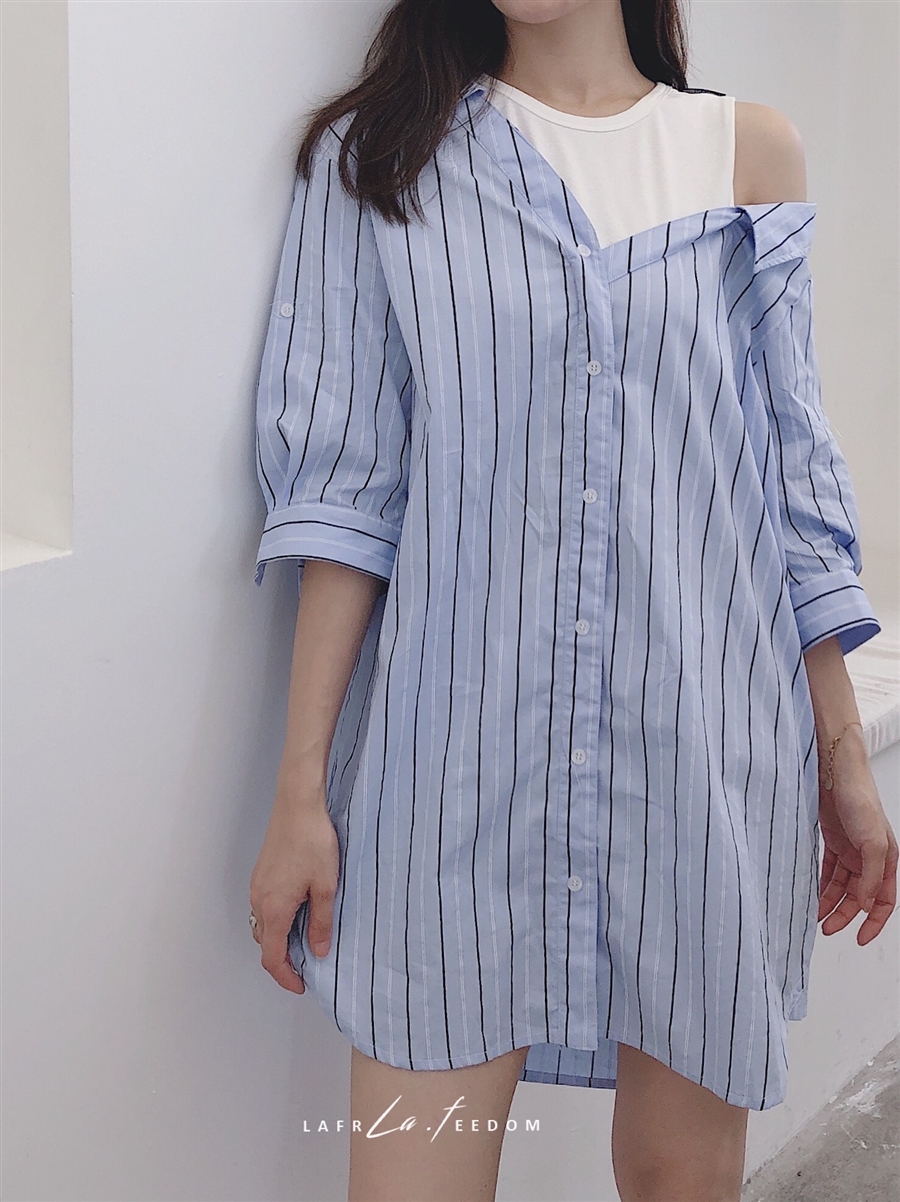 200620蓝条露肩假两件衬衣裙