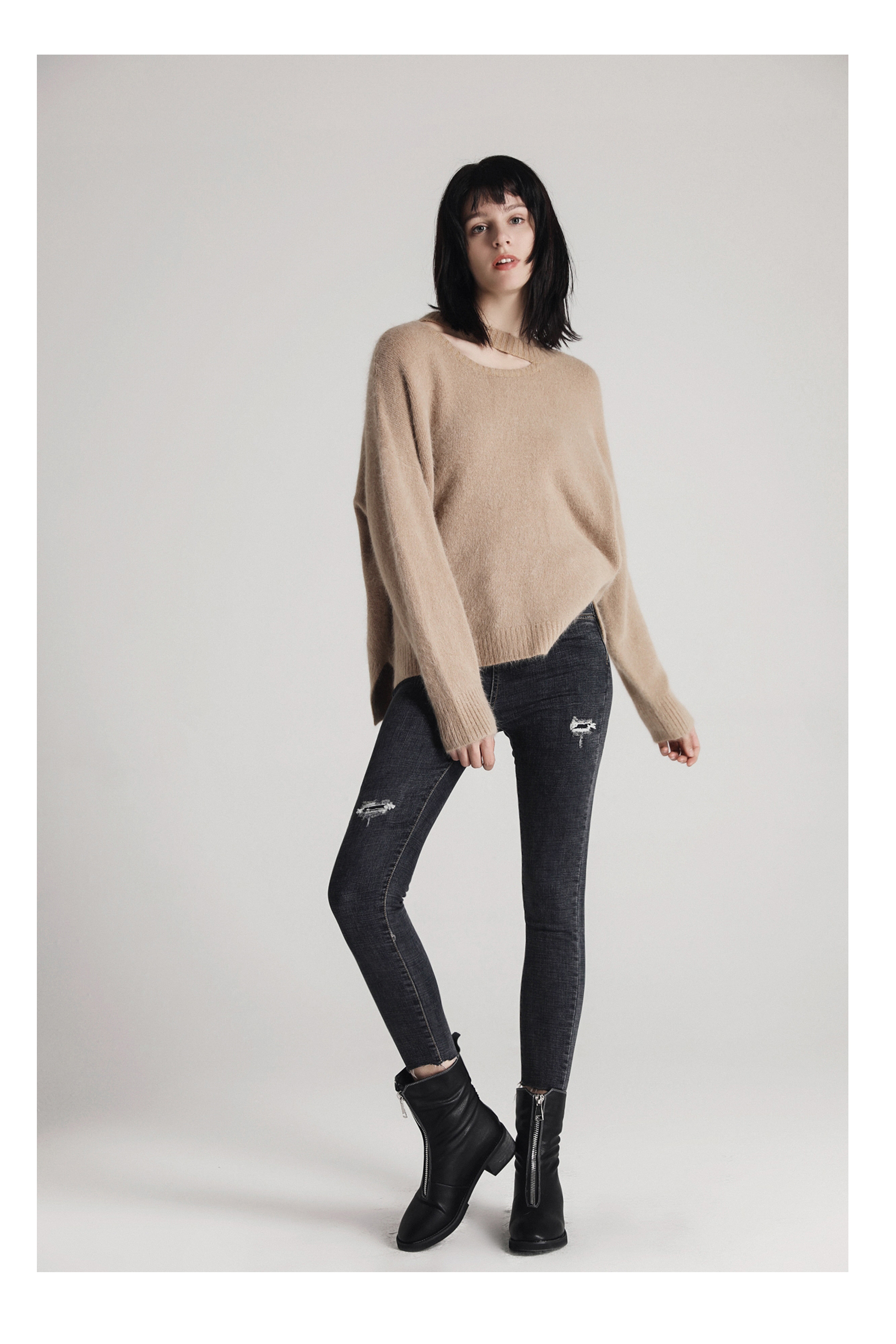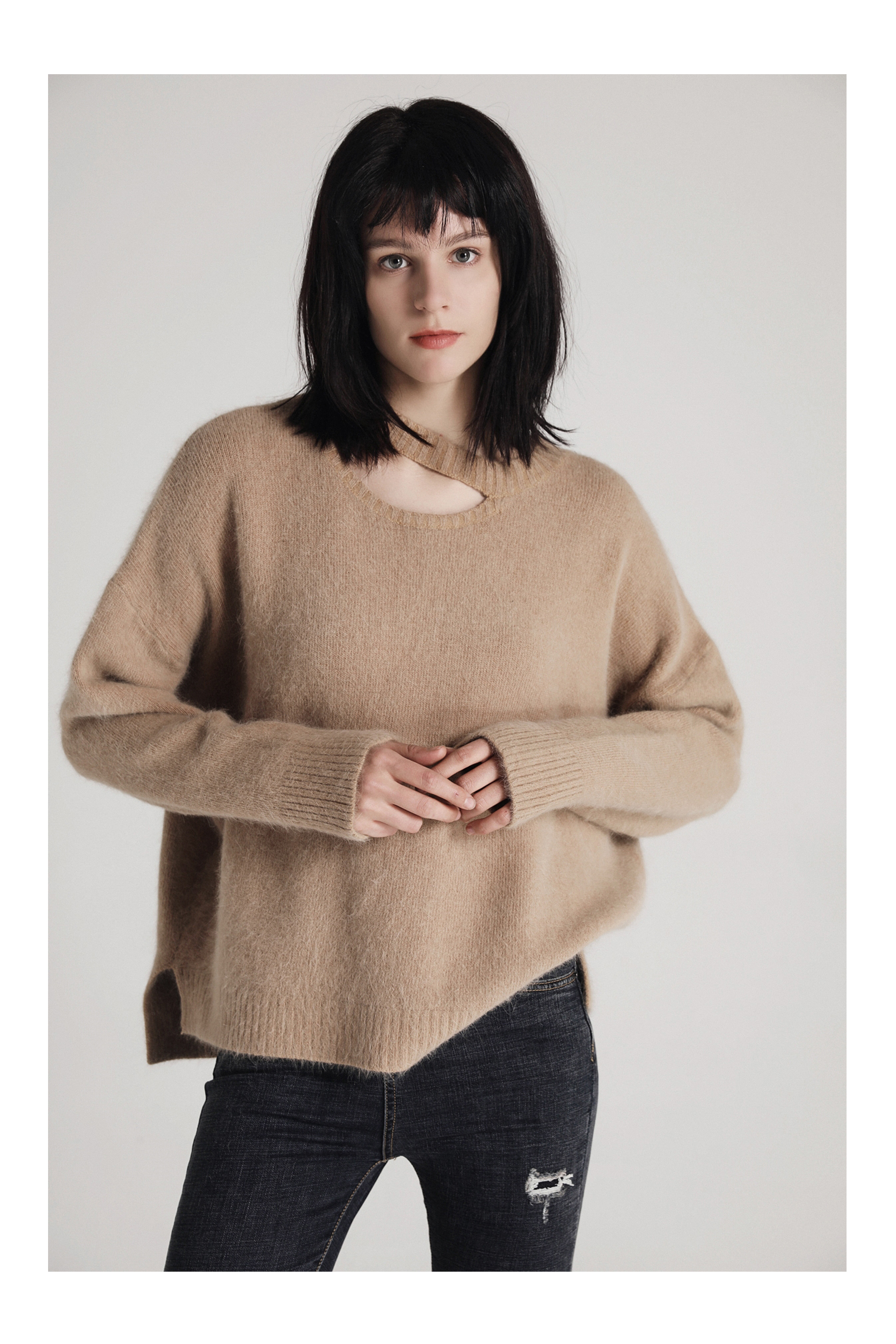 貂绒镂空肩毛衣-卡其色