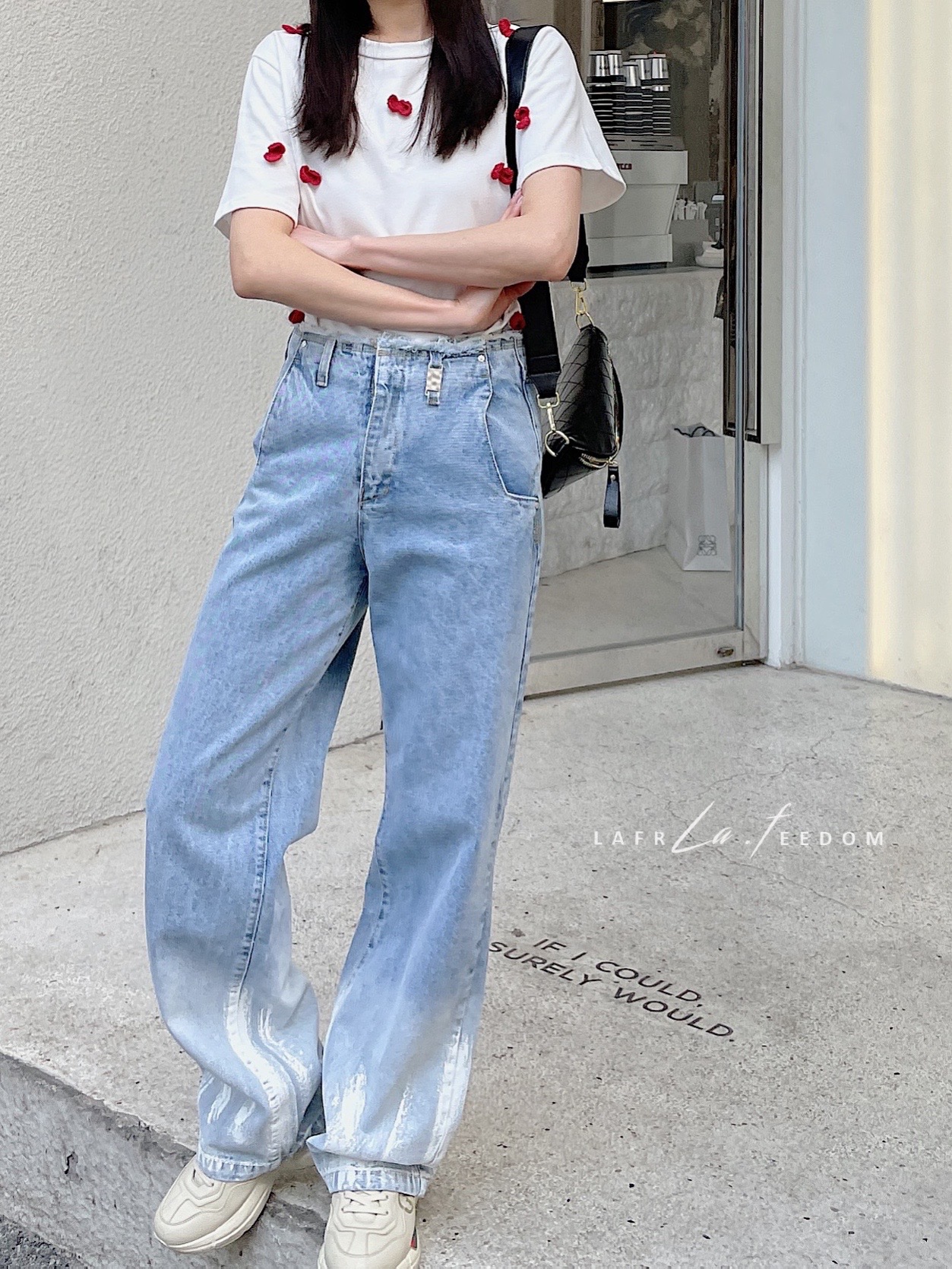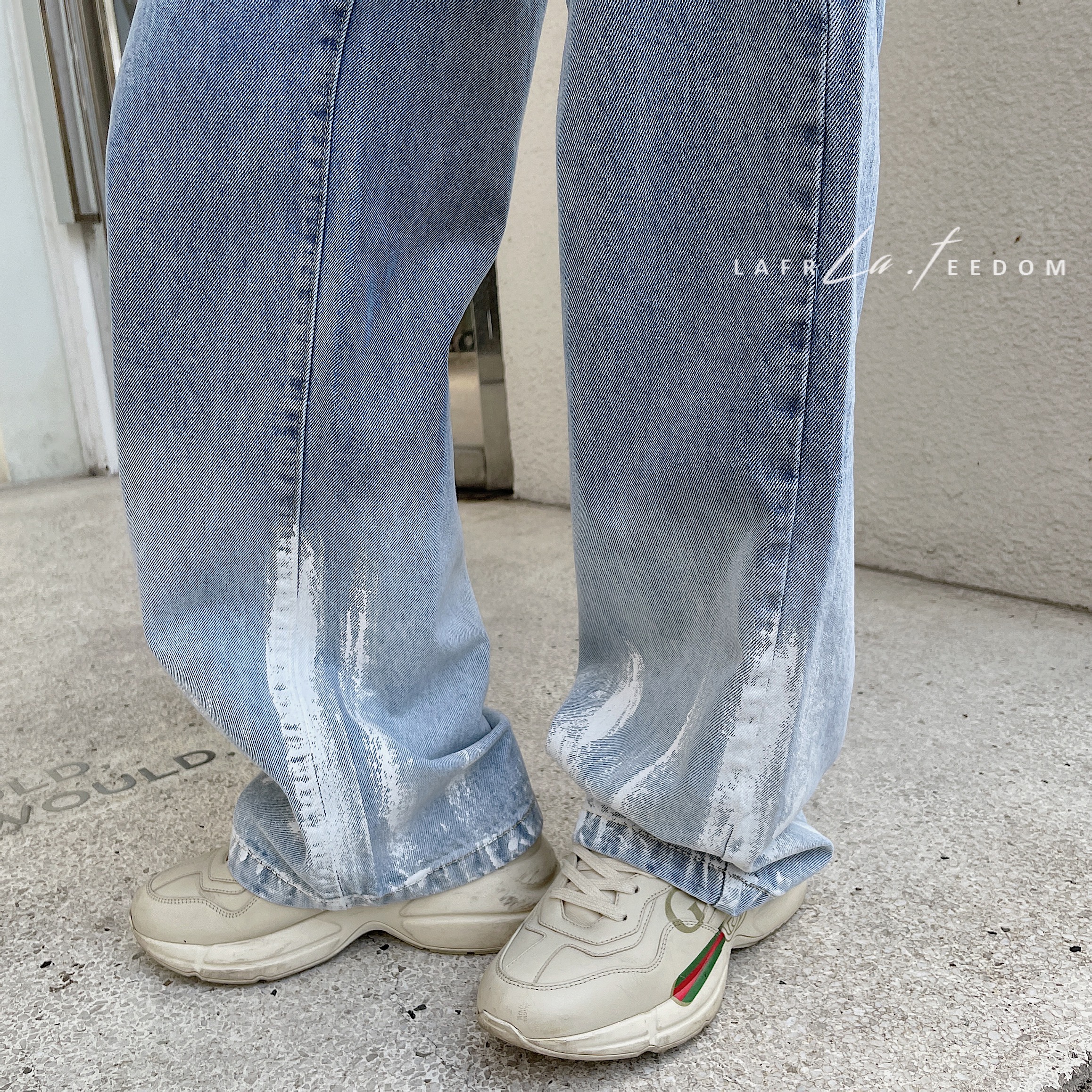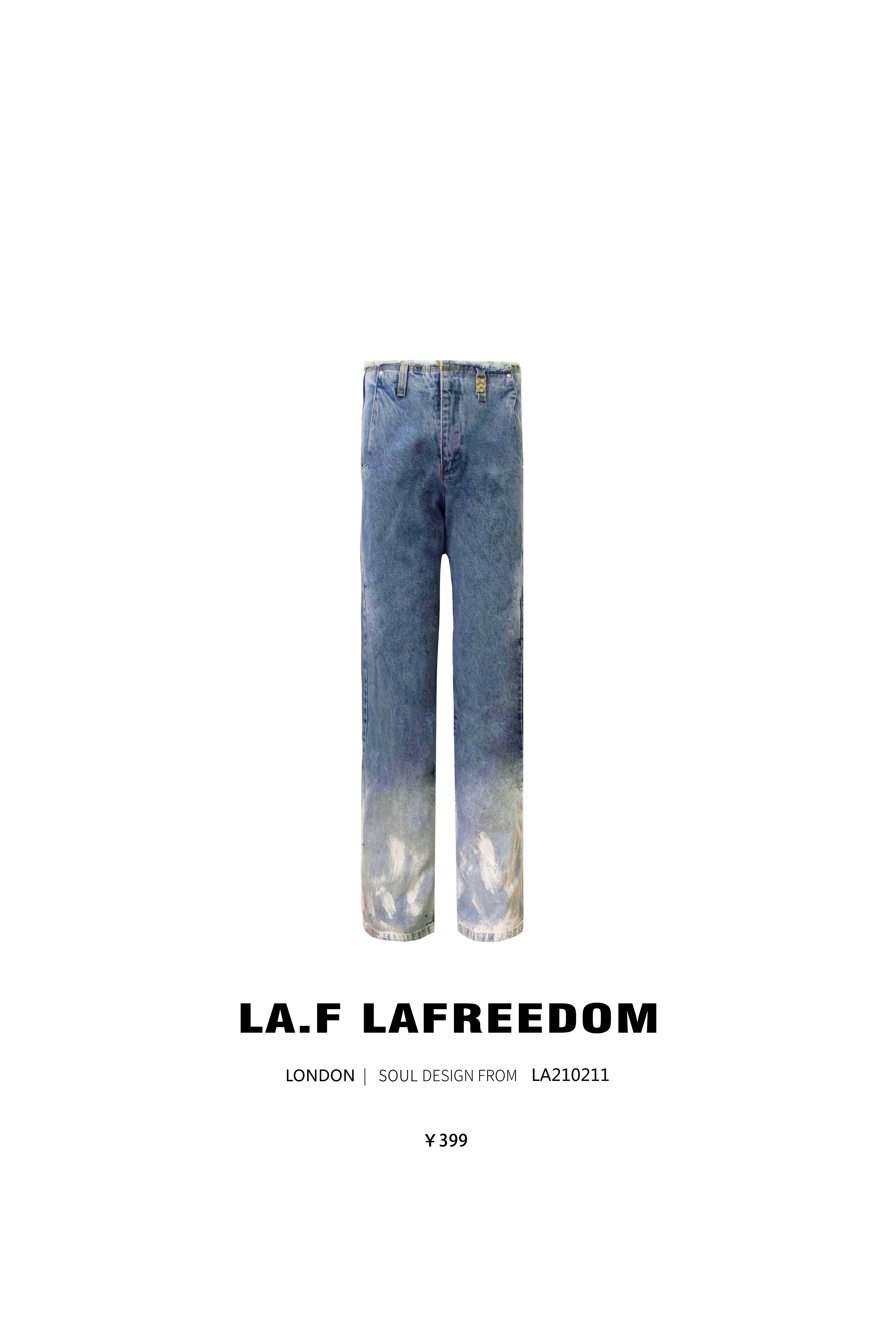 LA210211羽毛渐变毛边高腰阔腿牛仔裤