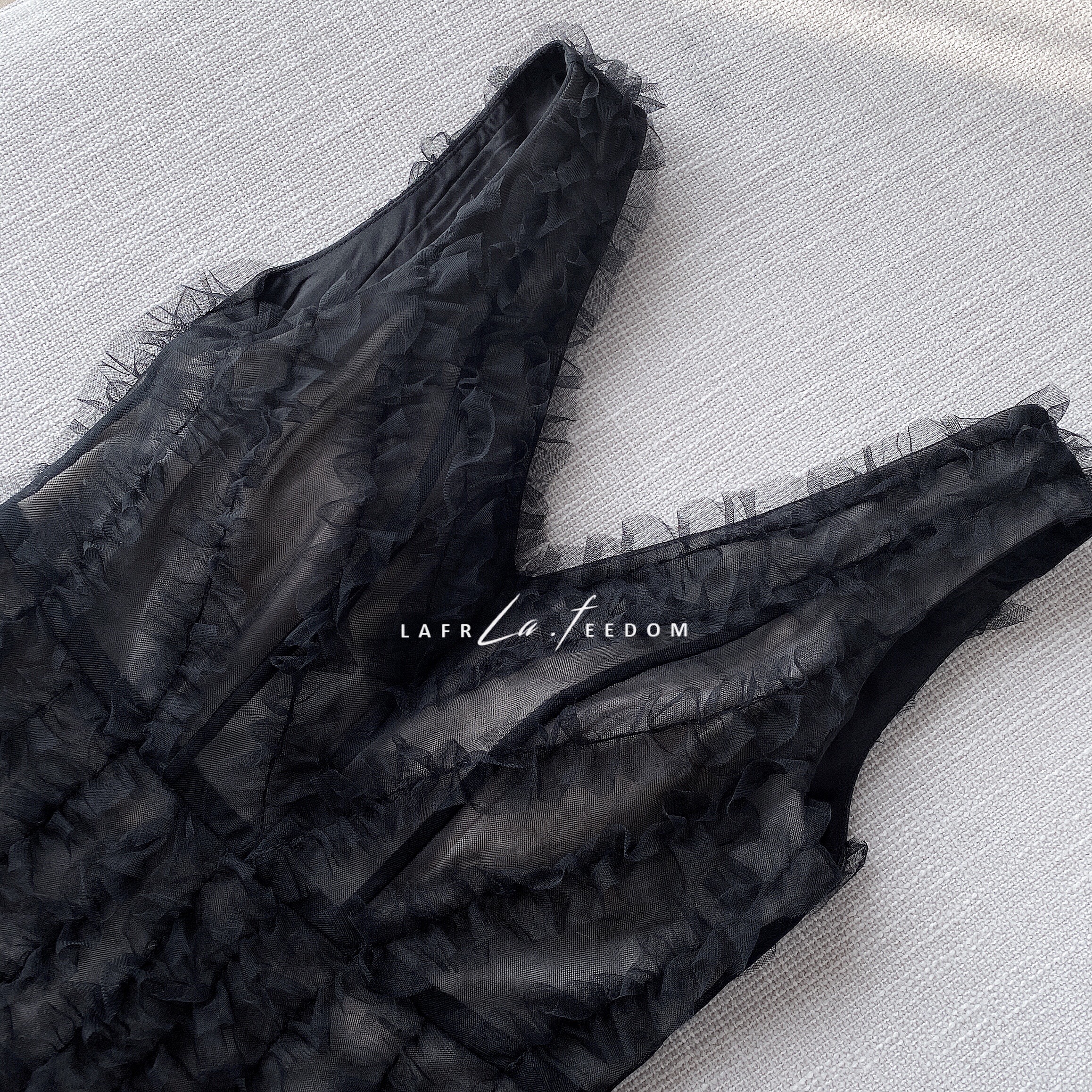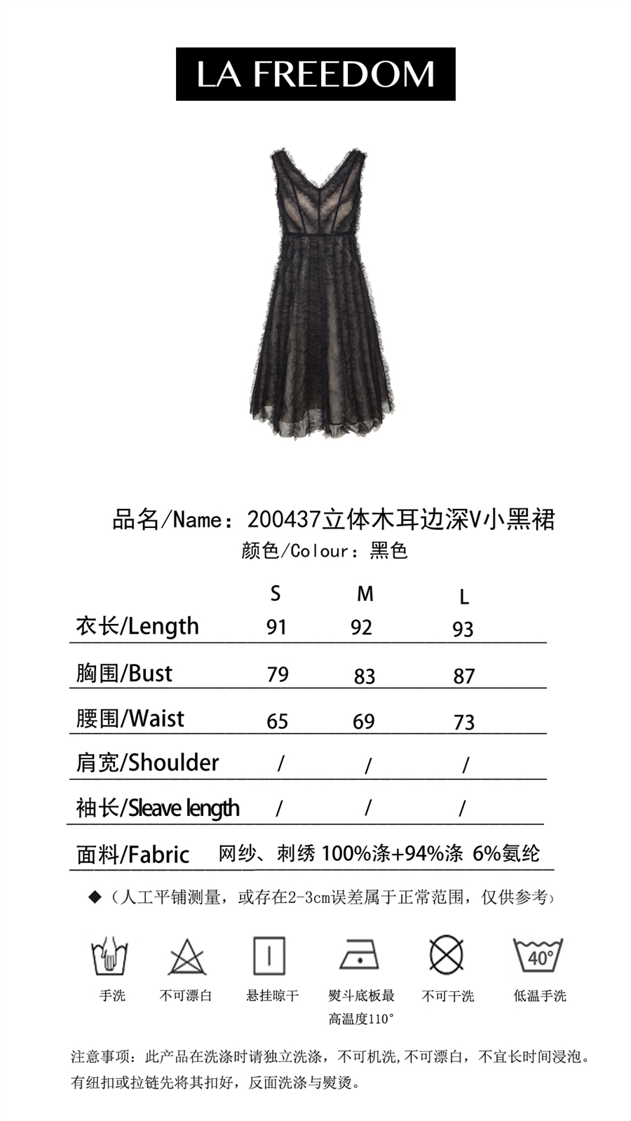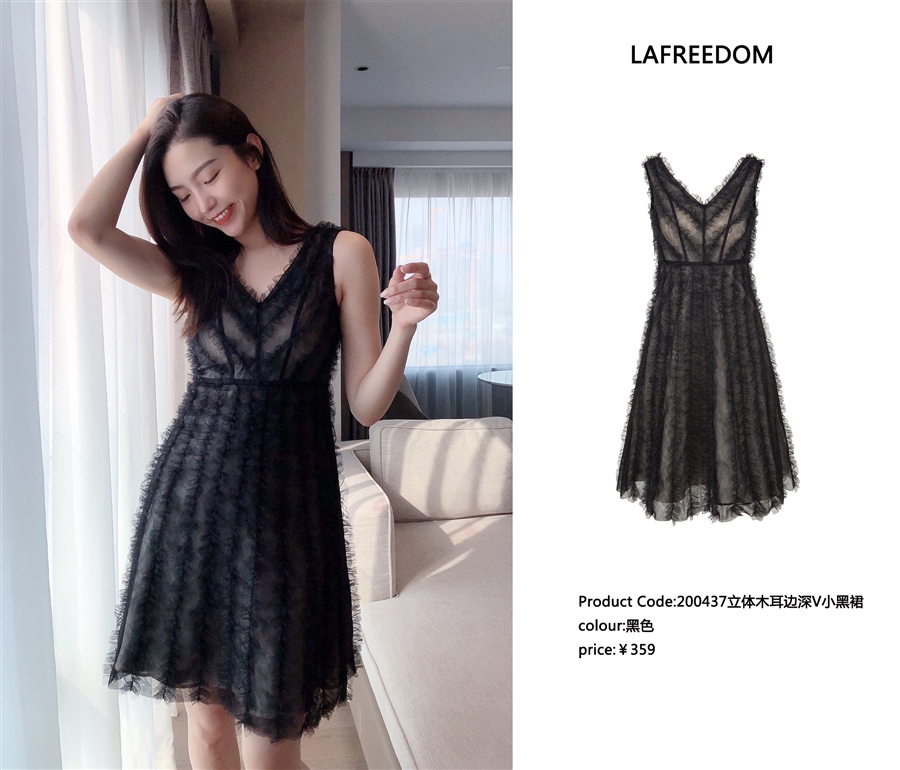 200437立体木耳边深V小黑裙
