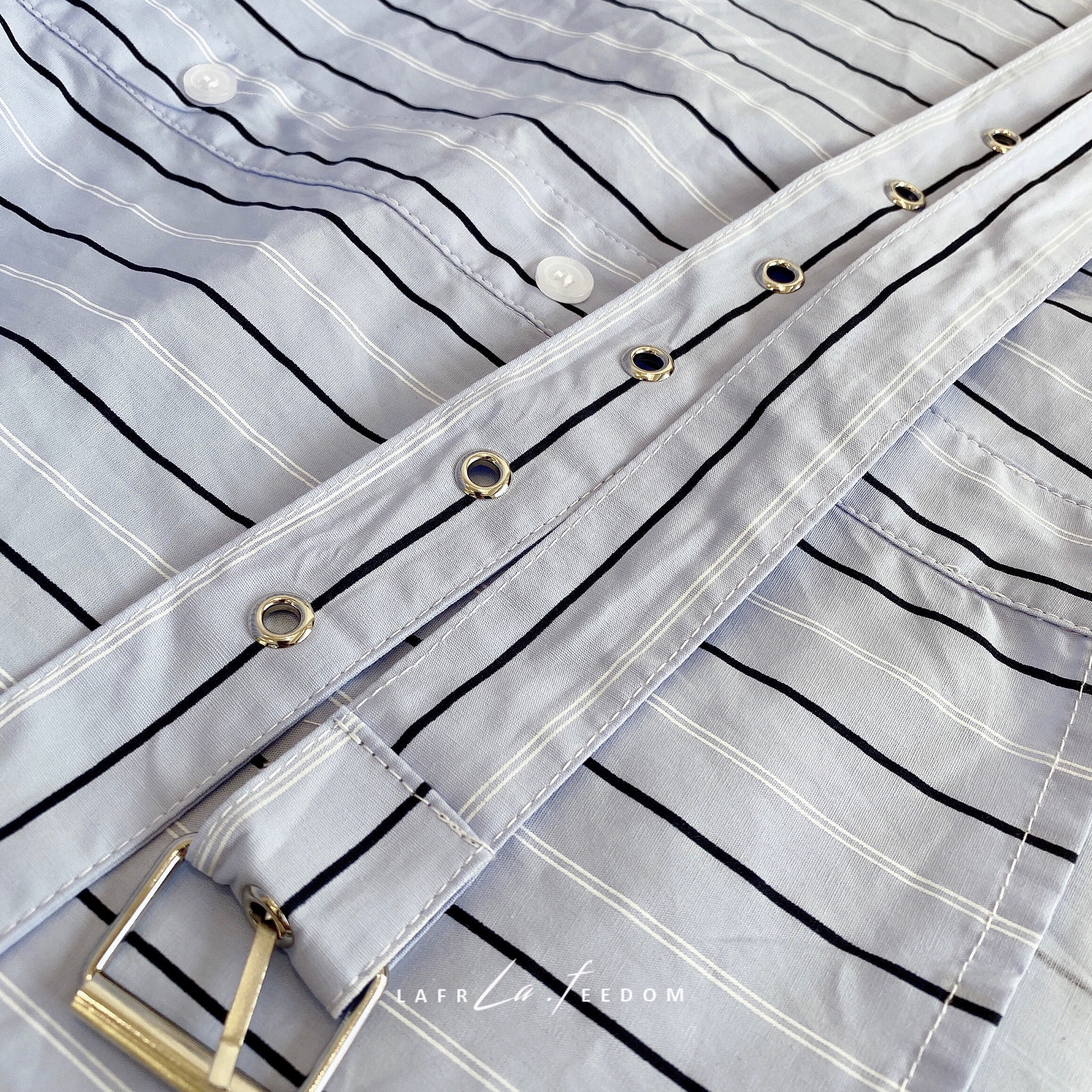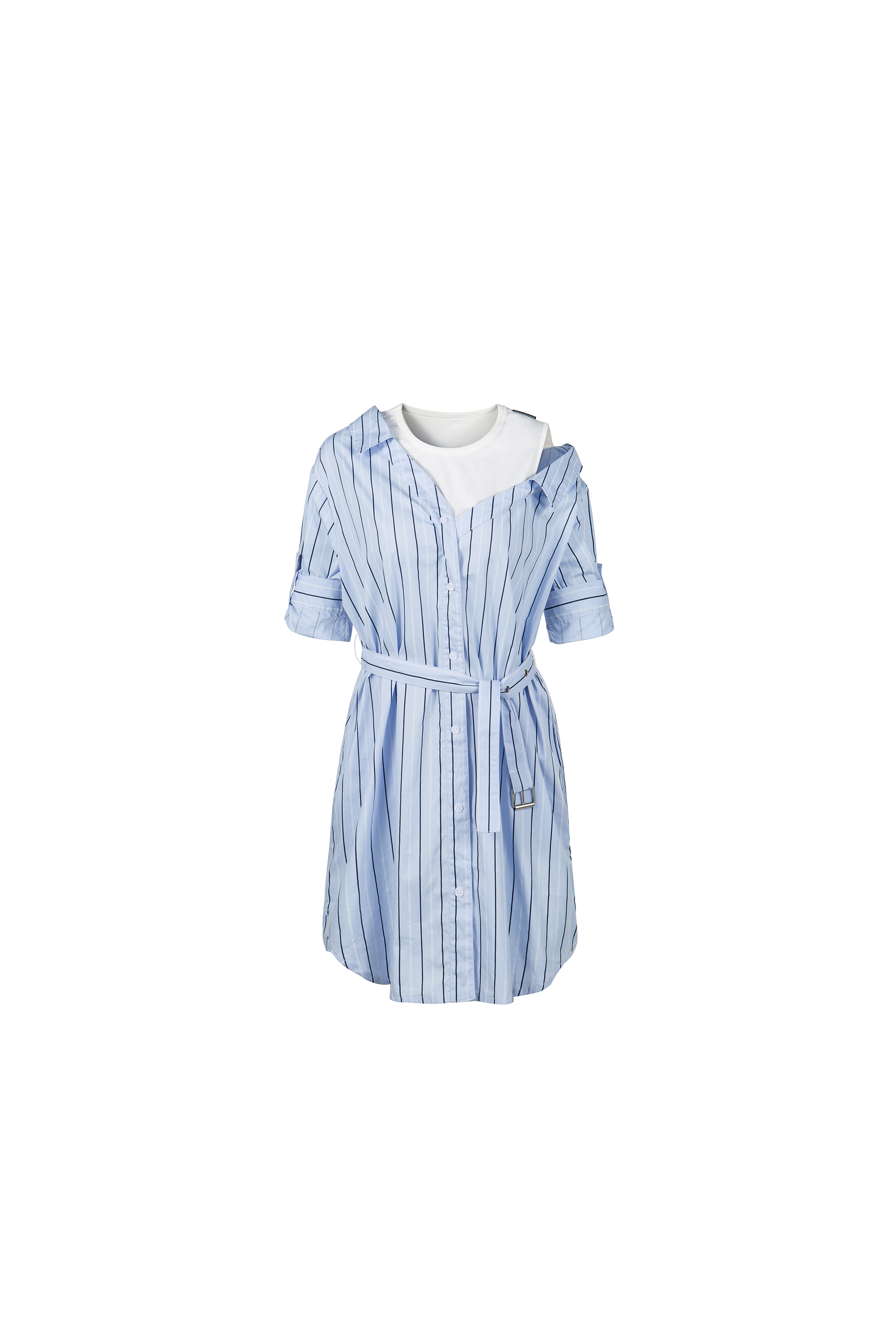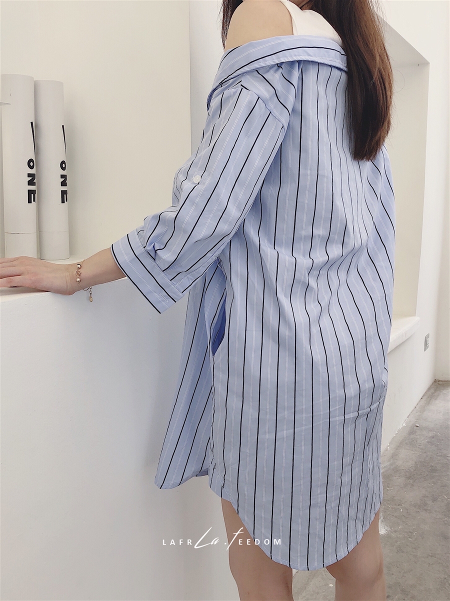200620蓝条露肩假两件衬衣裙