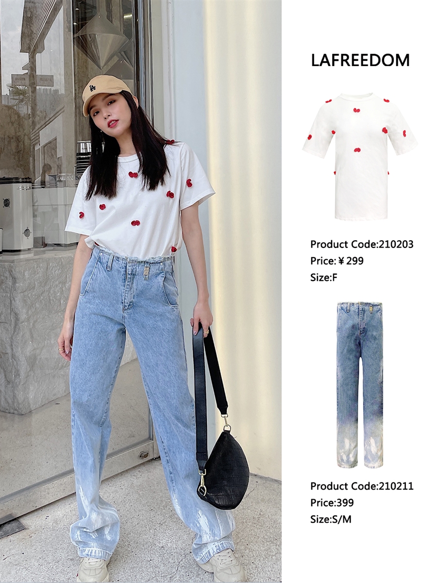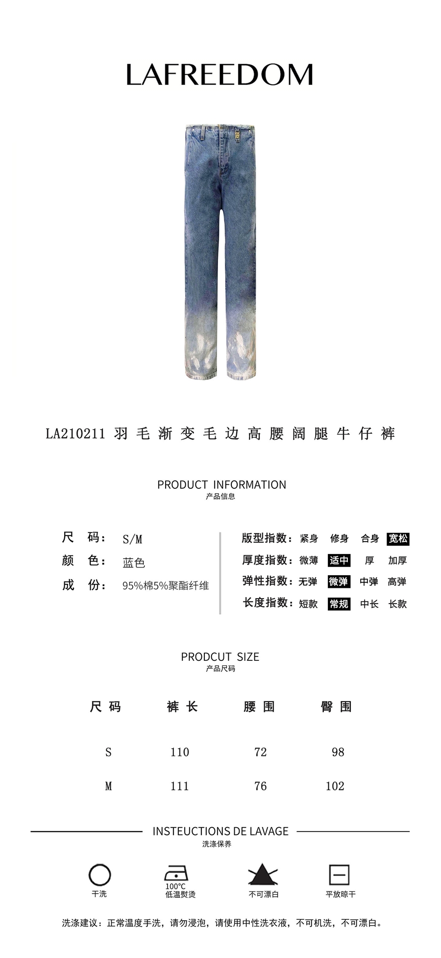 LA210211羽毛渐变毛边高腰阔腿牛仔裤